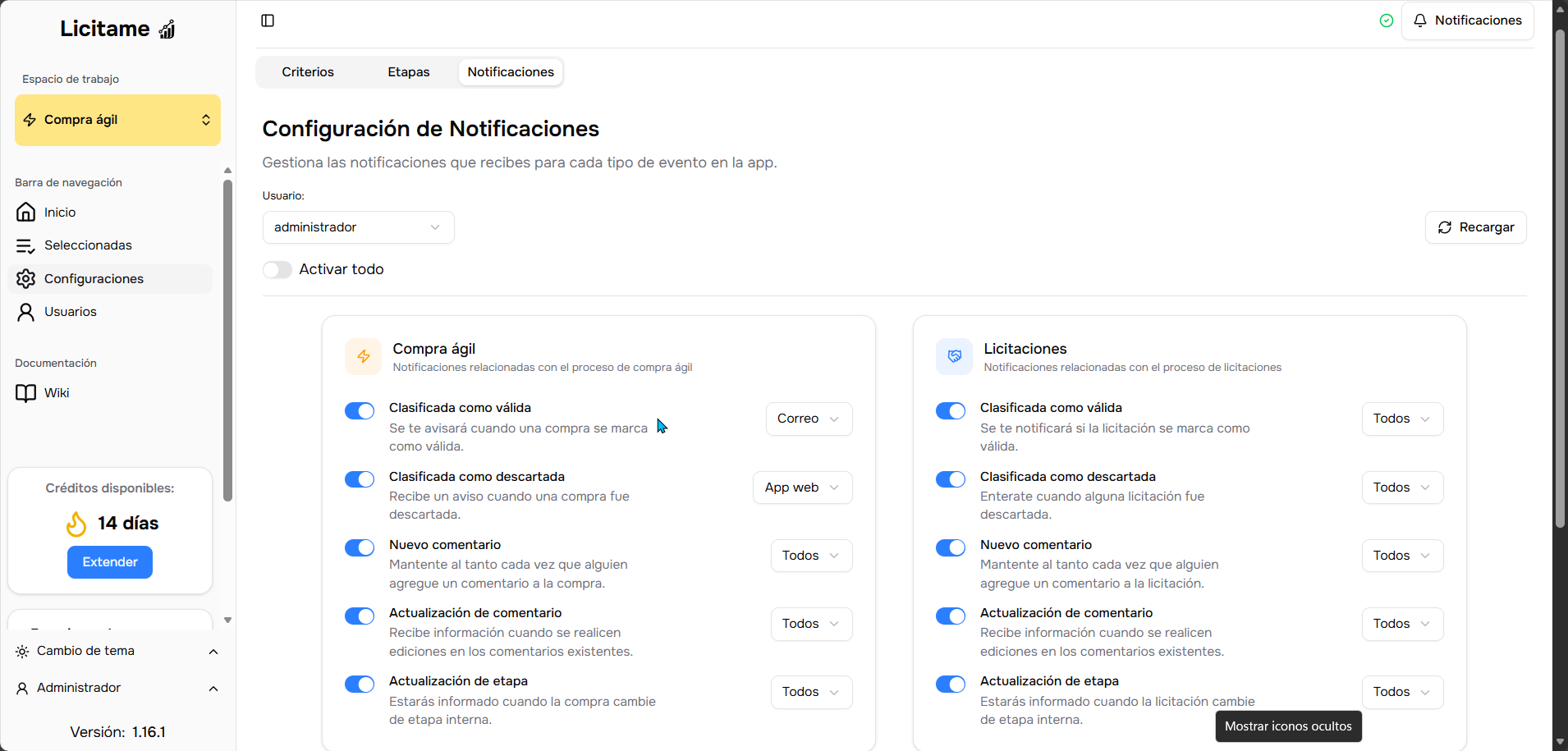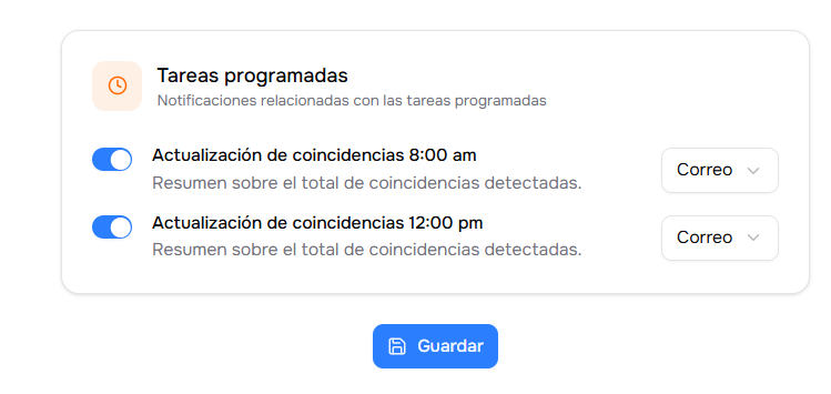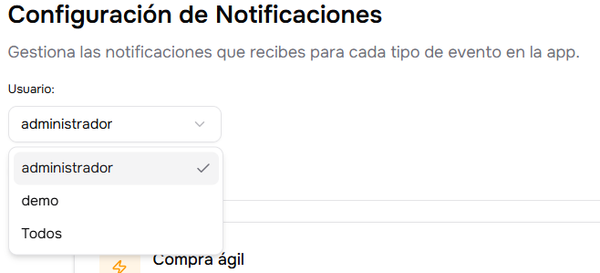 Los administradores pueden gestionar las notificaciones de cualquier usuario mediante el selector de destinatarios. Al guardar los cambios, estos se aplicarán al perfil seleccionado o, en caso de marcar la opción 'Todos', se actualizarán masivamente las preferencias de toda la base de usuarios.