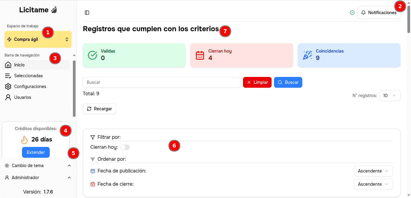 La interfaz de licítame consta de varias áreas que ayudan a trabajar de manera eficiente entre usuarios y flujos de navegación.